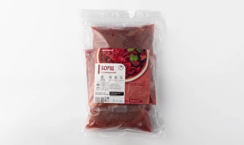 vБорщ на мясокостном бульоне, сваренный со свежими овощами и нежной нежирной говядиной. Сытный, ароматный, без лишних добавок: без уксуса, растительных масел и добавленного сахара. Метод шоковой заморозки позволил надолго сохранить насыщенный вкус, а большой упаковки хватит, чтобы накормить всю семью. Подготовить борщ к подаче просто: можно разогреть в кастрюле без предварительной разморозки или разморозить в холодильнике и разогреть в СВЧ-печи. В упаковке — 2 порции по 500 г в отдельных пакетиках.