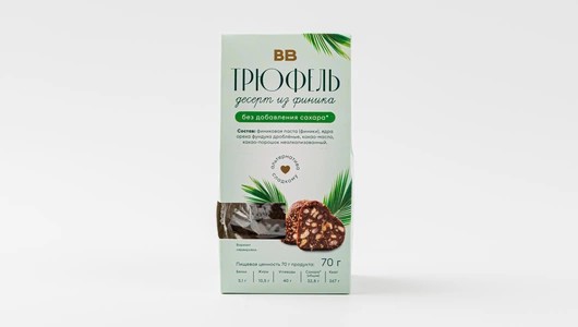 Мягкий десерт на основе фиников с деликатным сладковатым вкусом и ореховой ноткой. Внутри — финиковая паста, какао-масло, какао и дроблёный фундук, сверху — тонкая обсыпка из неалкализованного какао. За счёт натуральных ингредиентов вкус получается плотным, как у настоящего шоколадного трюфеля. Подходит для небольшого сладкого перекуса или дополнения к чашке кофе. Не содержит добавленного сахара — только натуральная сладость фиников.