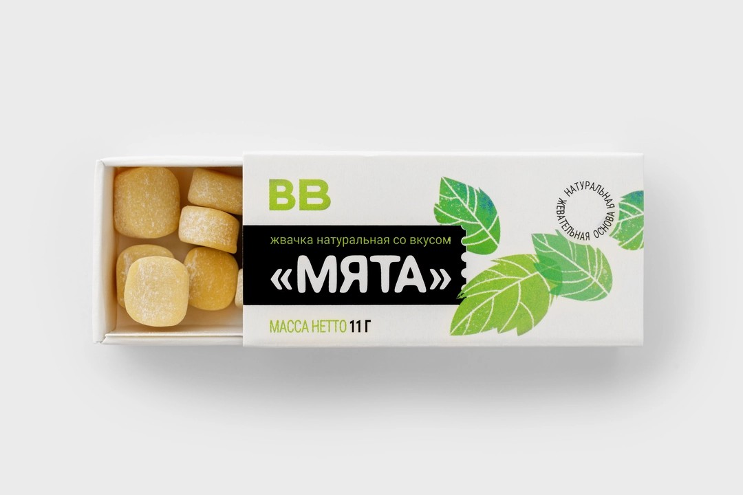 Жевательная резинка на основе воска и сока гевеи. Подслащена тростниковым сахаром. Терпкий мятный вкус жвачке придаёт натуральный ароматизатор. Незаменима, когда нужно освежить дыхание после приёма пищи.