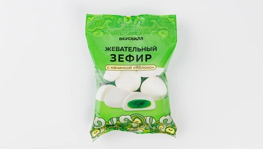 Мягкие, упругие и приятные на ощупь — эти мини-зефирки больше похожи на нежные маршмеллоу: сначала пружинят, затем быстро тают во рту, оставляя лёгкое ванильное послевкусие. Яблочная начинка с натуральным соком даёт освежающую кислинку без приторности. Её ровно столько, чтобы разнообразить вкус, но не перебить нежность зефира. Консистенция быстро превращается во рту из жевательной в тающую, поэтому одна штучка исчезает быстрее, чем успеваешь заметить. Удобный формат, чтобы захватить с собой или угостить кого-то просто так — без повода.