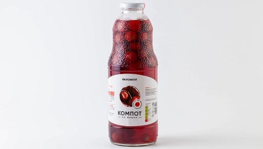 Компот из свежей вишни с косточкой. Приготовлен по домашнему рецепту: помимо ягод, в составе только вода и сахар. Сладкий, насыщенный и очень ароматный.