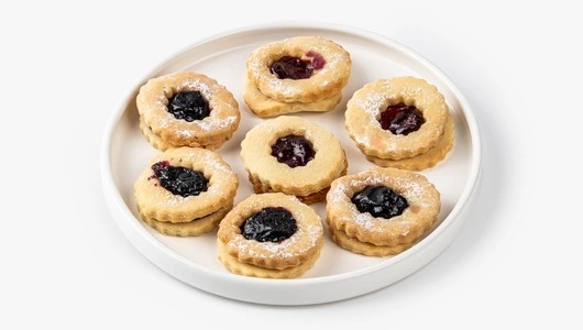 Свежее песочное печенье-сэндвич с мармеладно-тягучим ягодным джемом. Прекрасное дополнение вашего сладкого чаепития.