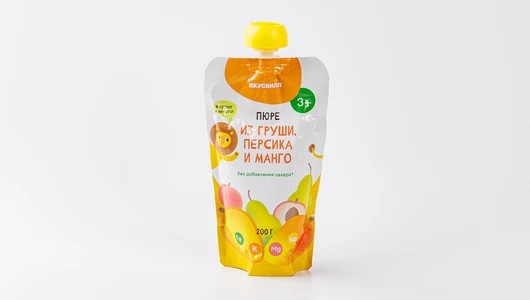 Большая упаковка натурального фруктового пюре без добавленного сахара. Состав максимально прост и полезен: только спелые груши, персики и манго! Лакомство имеет лёгкую однородную консистенцию и приятный сладковатый вкус. А благодаря дой-паку с удобным носиком и плотно закручивающейся крышкой, перекус можно устроить и на прогулке, и в дороге. Рекомендовано детям от 3 лет.
