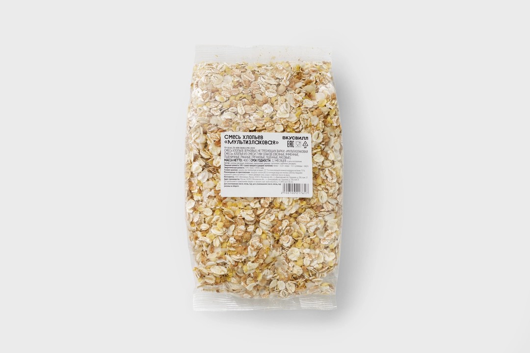 Смесь хлопьев из семи видов злаков. Идеально подходит для быстрого и питательного завтрака. Чтобы каша стала ещё вкуснее, к ней можно добавить мёд, джем, орехи или фрукты. Не подходит для варки.