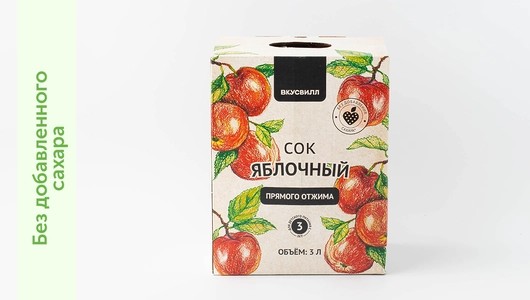 Сок прямого отжима из свежих яблок. Без добавленного сахара и других дополнительных ингредиентов. С ярким кисло-сладким вкусом и выразительным ароматом. Подходит детям от 3 лет. Если вкратце описывать процесс изготовления, то фрукты моют и перебирают, измельчают, подают на пресс, полученный сок фильтруют, пастеризуют щадящим методом и разливают. Всё. Можно сказать, что это практически тот же свежевыжатый сок, только в пакете.