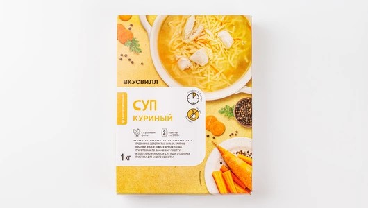 Большая порция домашнего куриного супа. Прозрачный золотистый бульон, крупные кусочки мяса и нежная яичная лапша. Без лука и резких специй. Разморозьте в холодильнике, перелейте в ёмкость и разогрейте на плите или в СВЧ-печи. Для удобства упаковали суп в 2 отдельных пакетика по 500 г.