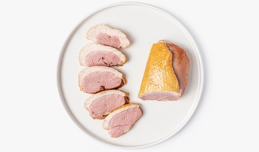Копчёно-вареная грудка утки с нежным мясом и тонкой золотистой кожицей. Мясо томлёное, сочное, с лёгким дымным ароматом и пряными нотами чёрного перца. Такую грудку удобно нарезать тонкими ломтиками для мясной тарелки, бутербродов, салатов или подачи с горчицей и свежими овощами.