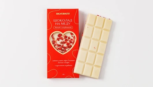 Белый шоколад с мёдом и кусочками клубники — это десерт с лёгким ягодным акцентом и естественной сладостью. Цельное молоко добавляет ему особенной нежности, а сублимированная ягода сохраняет вкус и аромат свежей. Небольшой плитки хватит, чтобы разнообразить утреннее чаепитие или устроить короткий перекус в течение дня. Шоколад можно вложить в букет в качестве сладкого комплимента, а можно дополнить им основной подарок.